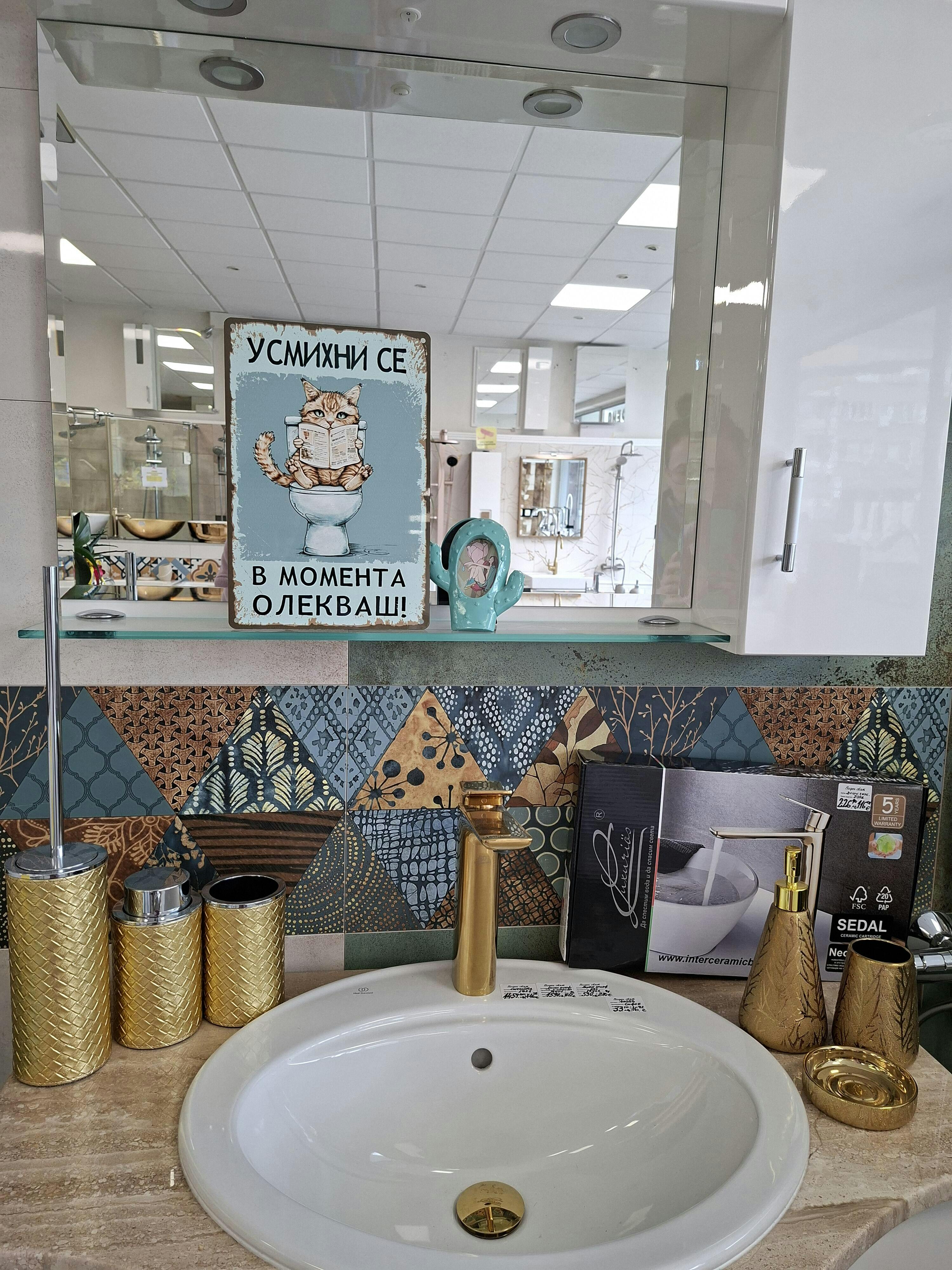 Тази очарователна метална декоративна табела е идеалният начин да добавите нотка хумор и чар към вашата баня. Изображението на пухкаво котенце, седнало върху тоалетната чиния и четящо вестник, ще ви разсмее всеки път, когато я видите. Надписът "Усмихни се! В момента олекваш!" е забавен и напомнящ, че не е нужно да се приемате твърде сериозно.